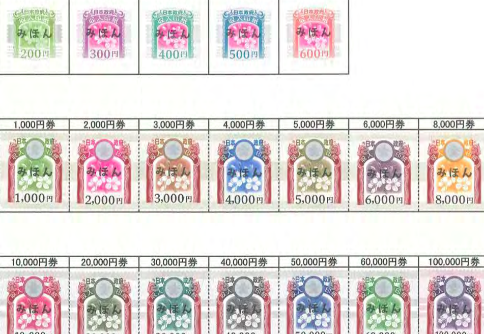 収入印紙には、金額に応じたいくつかの種類があります。これにより、さまざまな文書に適合した印紙を選ぶことができます。こちらが主な種類です。
