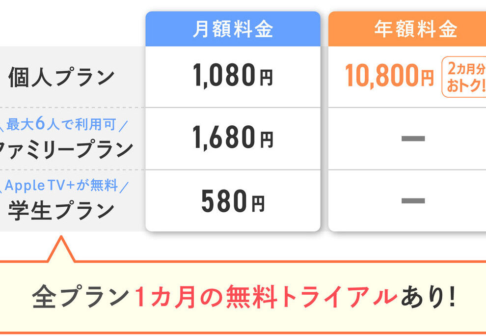 | Apple Music | 980円 | 1,480円 | 480円 | オフライン再生、全コンテンツアクセス |