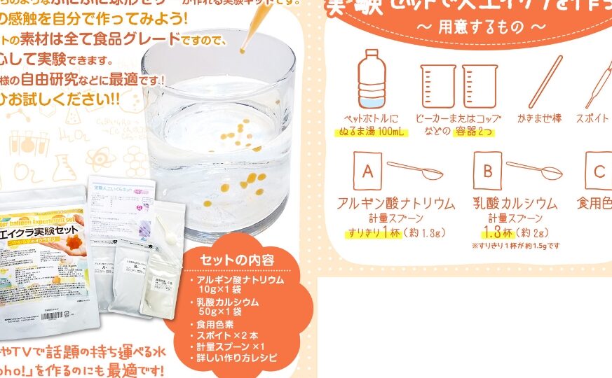 人工イクラの製造方法は、主に植物由来の成分を使用して行われるため、環境に優しい選択肢として注目を集めています。このセクションでは、原材料と製造プロセスについて詳しく説明します。