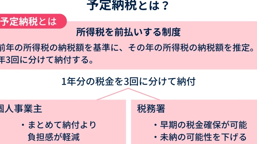 予定納税とは、あらかじめ所得税を計算し、所定の期日までに納付する制度です。自営業者やフリーランスにとって、収入の変動が大きいため、この制度は特に役立ちます。この仕組みにより、年末の納税額を分散させ、経済的な負担を軽減します。