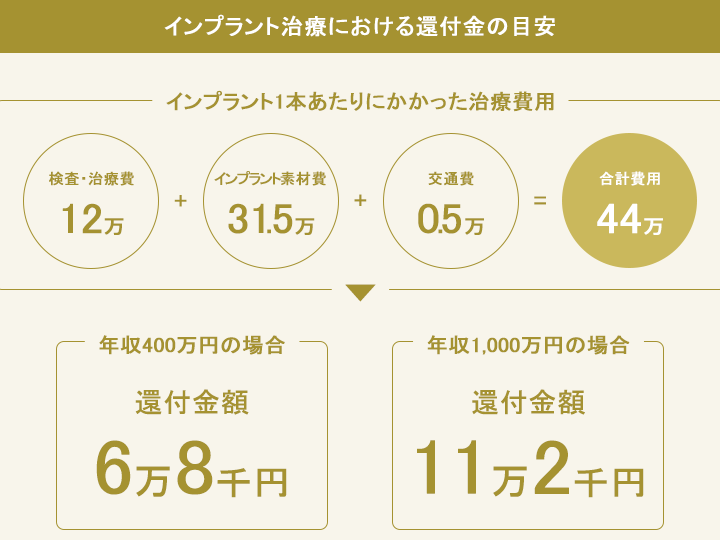 医療費控除に基づく返ってくる金額の目安は、個々の医療費や所得によって異なりますが、平均的にはインプラント治療の費用の20%から25%が還付されるケースが多いです。たとえば、治療費が80万円であった場合、次のように計算します。