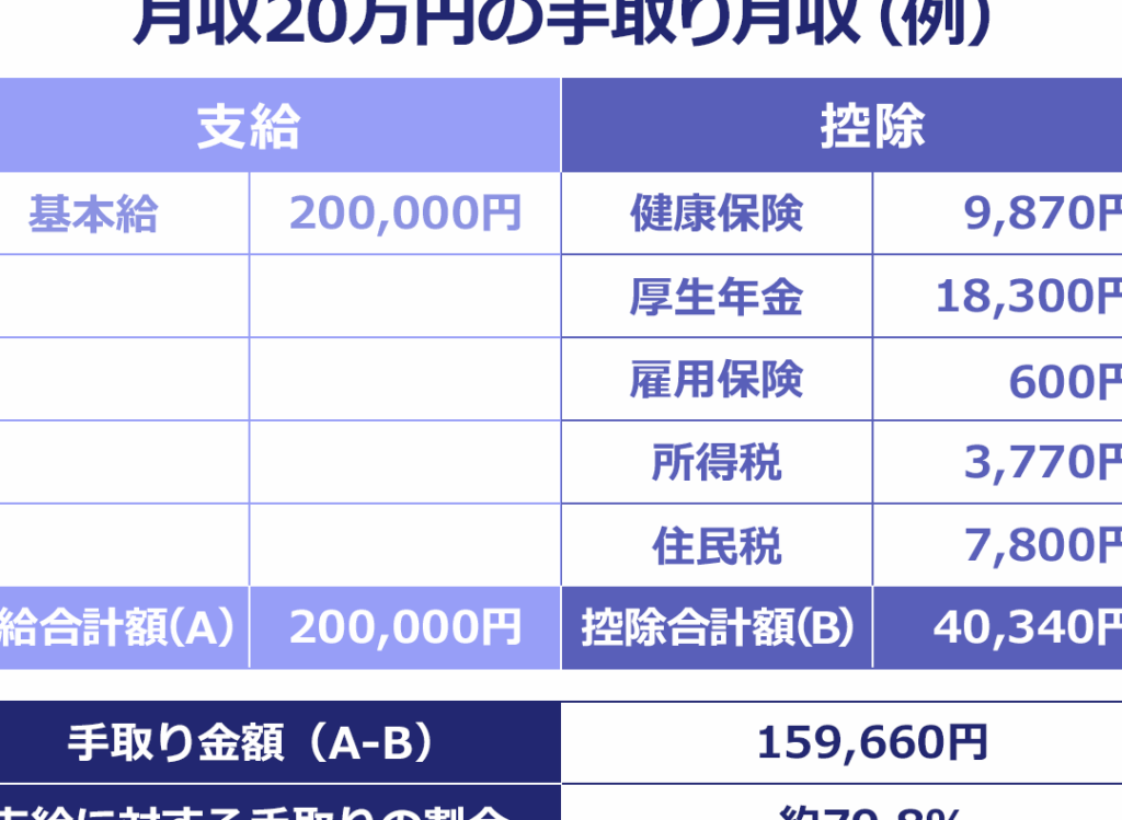 - 健康保険: 給与の約4.9%が引かれる。例えば、20万円の場合、約9,800円。