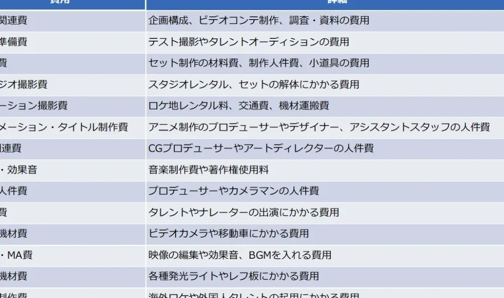 制作費用には、複数の要素が含まれる。具体的には、以下の項目が挙げられる。
