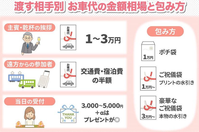 お車代は、結婚式に参加するゲストへの交通費をカバーするための重要な金額です。ここでは、地域やゲストとの関係性による相場を詳しく見ていきます。