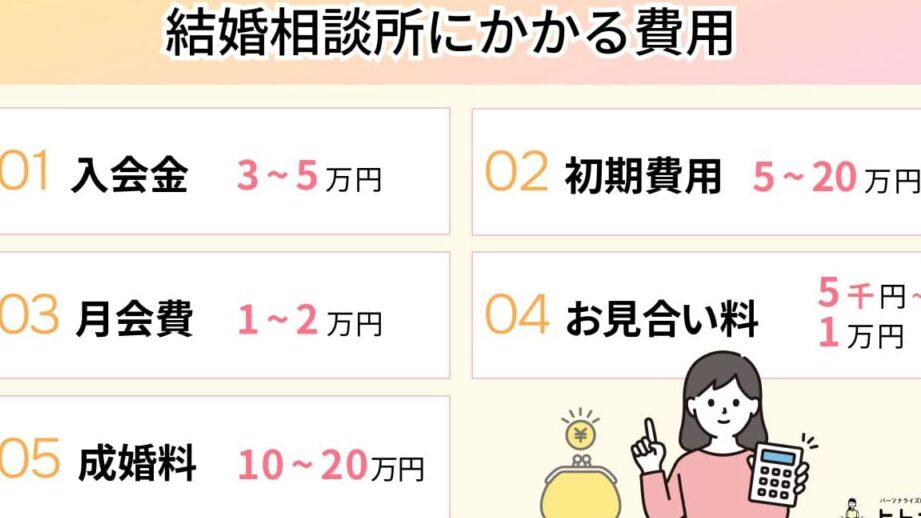 - 成婚料:成果報酬として支払う料金。多くは50,000円から200,000円程度。