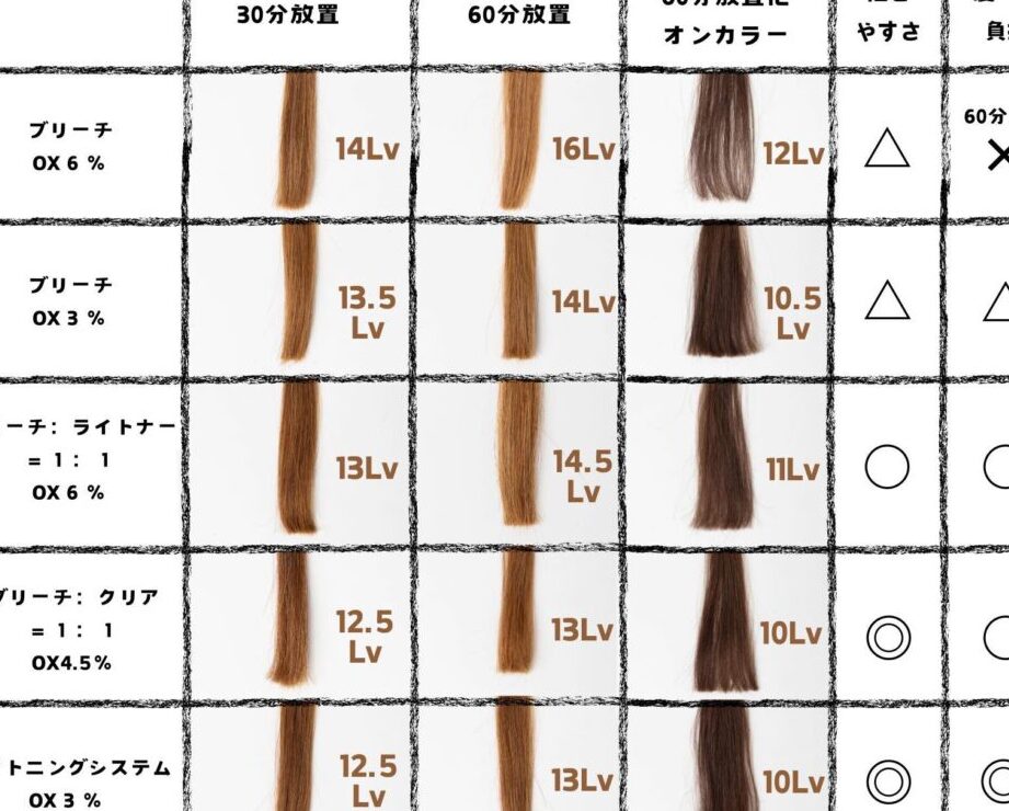 これらの要素に基づいて、ブリーチ時間を30分から60分の範囲内で調整します。特に細い髪の場合は、30分以内が推奨されます。
