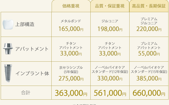 - 入れ歯:初期費用が低いが、定期的な調整や交換が必要。結果的にトータルコストが増加。