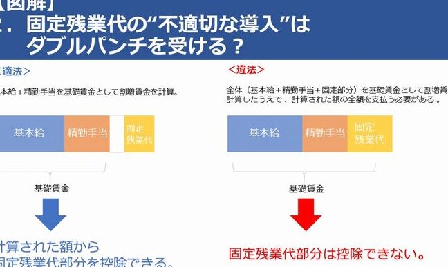 法的リスクが大きな問題です。企業が固定残業代を設定する場合、正確にその内容を労働契約に明記しなければなりません。労働時間の実態と固定残業代の基準が整合しないと、労働基準法に違反する可能性があります。また、労働者が実際の残業時間を訴える場合、企業に不利な状況が生じることもあります。具体的には、以下のようなリスクがあります。