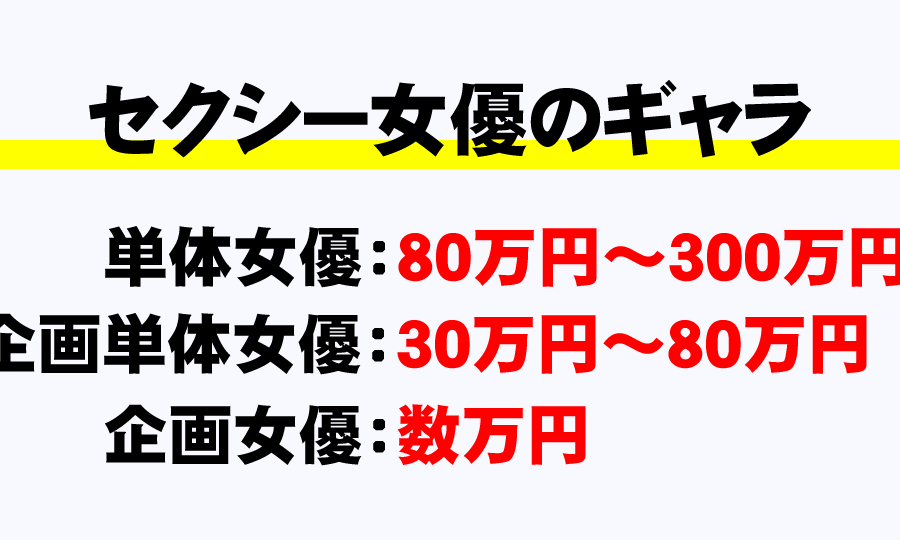 <強>人気のある女優</強>は、特に高い収入を得ることができる。例えば、一部のトップAV女優は、単体作品で100万円以上を得る場合がある。一方で、駆け出しの女優は、最初の数ヶ月で数万円からスタートすることも珍しくない。