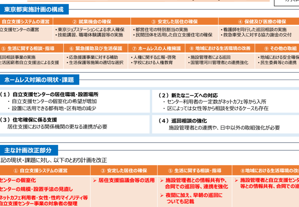 - 定期的な現状把握調査:ホームレスの実態を正確に把握し、効果的な政策を策定するためのデータ収集を行っています。