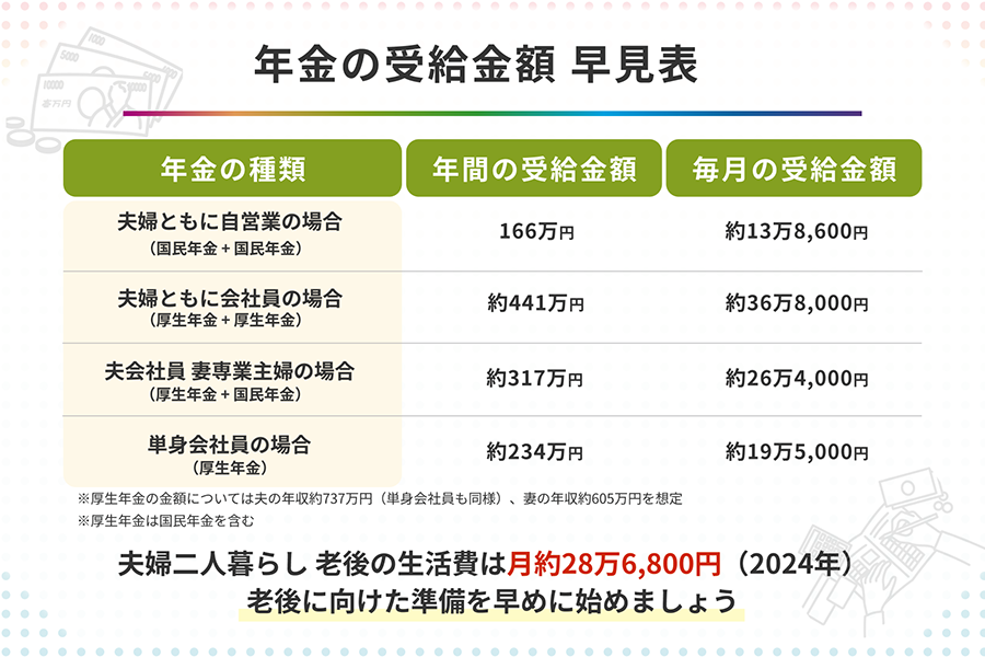 具体的には、基礎年金は満額で約78,000円/月、厚生年金は平均的に約150,000円/月支給されます。このため、自分が受け取る年金額の計算には、以下のような要素が影響します。