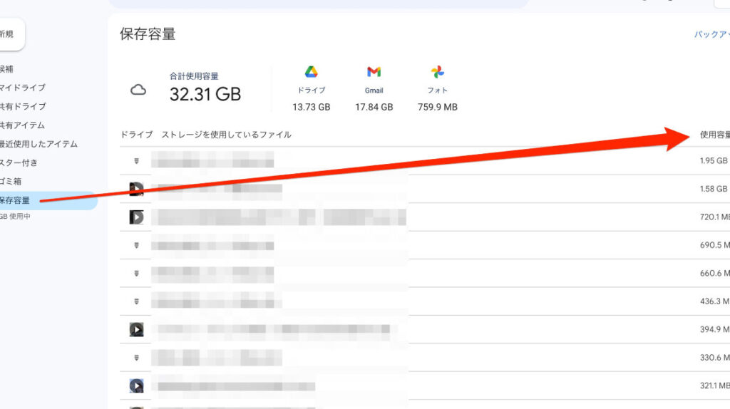 使用中の容量がどのサービスにどれだけ使われているかを把握することで、必要に応じてメールやファイルを整理できます。