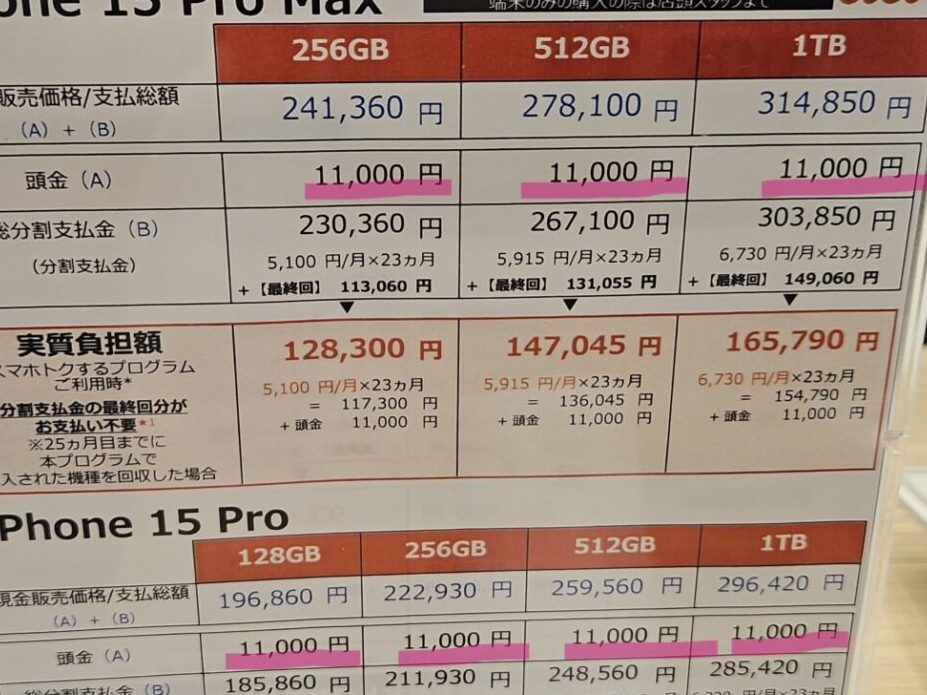 - 高性能機種: 最新のiPhoneやGalaxyシリーズで、頭金が30,000円以上になることがあります。