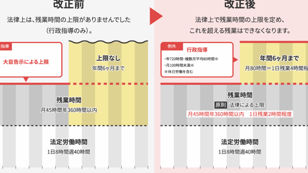 - 法改正: 労働基準法の改正により、残業の上限が設けられ、労働者の権利保護が強化されている。