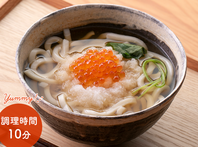 茹でたうどんを器に盛り、上にいくらとトッピングを載せます。最後に温めたつゆをかけて完成です。