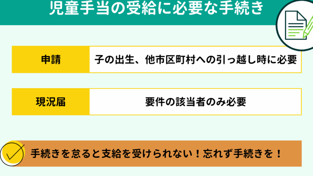 また、申請期限も重要です。通常、子供が生まれた日から1ヶ月以内に申請を行うことで、遡って支給される可能性があります。この期間を見逃すと、手当を受け取る権利が失われることもあるため、注意が必要です。