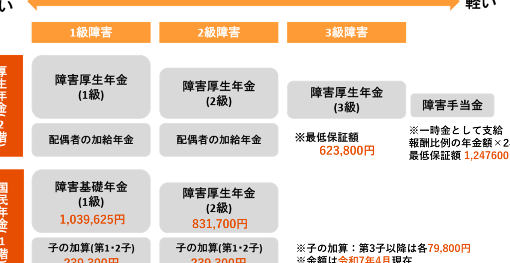 - 障害の等級: 等級は、1級または2級に分かれ、障害の程度に応じた基準があります。