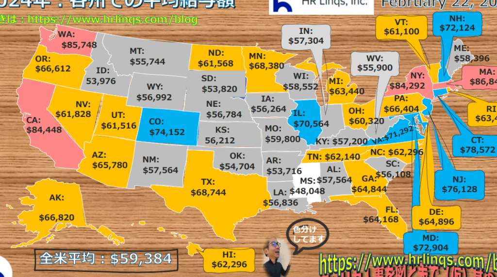 地域によって平均年収には顕著な違いがあります。例えば、ニューヨークやカリフォルニアでは、平均年収が$90,000を超えることもあります。一方、南部の州では、$60,000以下の地域も存在します。以下がいくつかの州の平均年収です。